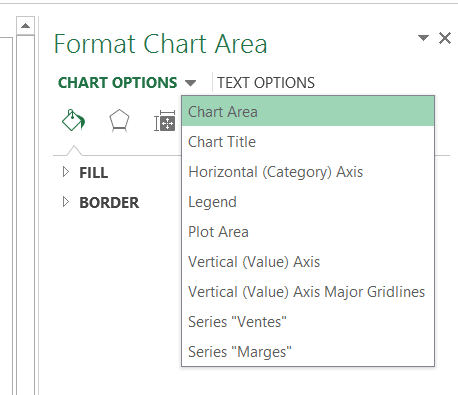 Vous pouvez cliquer dans votre graphique et aller ensuite dans le menu Format. Vous verrez un menu déroulant en haut à gauche. Ce menu déroulant vous permet de sélectionner individuellement les éléments de votre graphique.