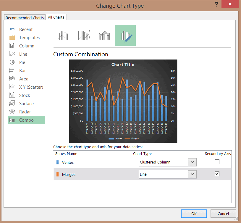 Si vous utilisez une version Excel 2013, vous avez accès à un type de graphique nommé graphique combo. À partir de cette option, vous pouvez aisément choisir un type de graphique et un type d’axe pour chacune de vos séries de données.