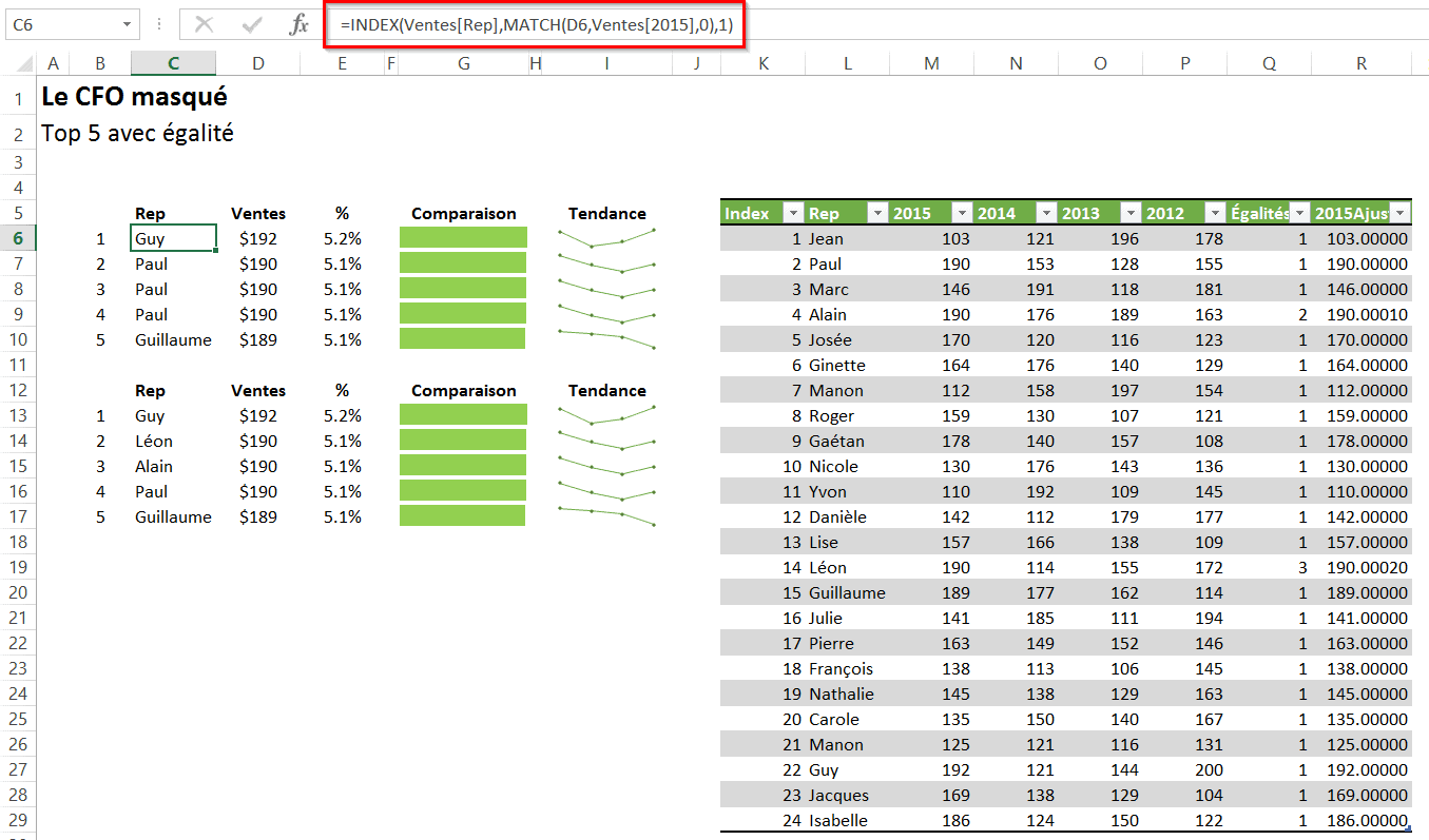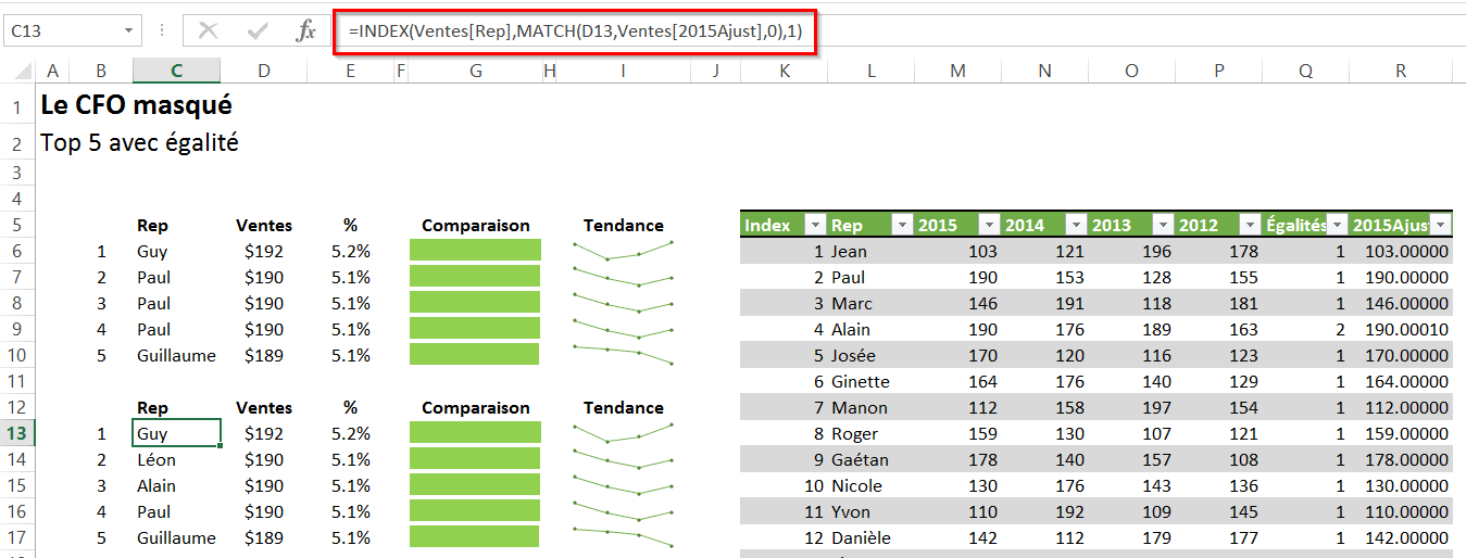 Pour trouver le nom des vendeurs correspondant au top 5 des ventes, j’ai utilisé la fonction INDEX. Le premier paramètre, Ventes[Rep], indique à Excel que la valeur recherchée se trouve dans la colonne [Rep] de la table de ventes. Le deuxième paramètre, MATCH(D6,Ventes[2015],0) ou en français EQUIV(D6;Ventes[2015];0), rapporte la position du montant de ventes indiqué dans la cellule D6 dans la colonne [2015] de la table de ventes (autrement dit, le numéro de la ligne sur laquelle il apparaît). Finalement, le 3ième paramètre indique que la valeur recherchée se trouvera dans la première colonne de notre table de recherche (qui n’a qu’une seule colonne de toutes façons), soit la colonne [Rep]. En résumé, Excel regarde sur quelle ligne figure le montant 192 dans la colonne [2015] de la table de ventes (22 dans notre exemple) et rapporte ensuite la 22ième ligne de la colonne [Rep], Guy dans notre exemple. On peut s’apercevoir qu’il y a des valeurs équivalentes dans mon top 5 dans Excel.