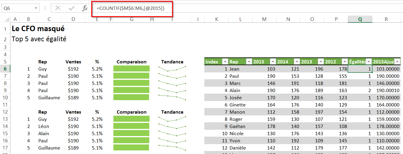 Les fonctions présentées ci-dessus fonctionnent parfaitement bien, sauf lorsqu’il y a une égalité parmi les 5 plus grandes valeurs. Dans notre exemple, 3 vendeurs ont vendu pour 190$. Comme on utilise une fonction INDEX, Excel rapporte toujours le nom du premier vendeur dans la liste qui a vendu pour 190$, soit Paul, dans notre exemple. Pour régler la problématique des valeurs équivalentes dans mon top 5 dans Excel, j’ai modifié légèrement ma table de ventes. D’abord, j’ai ajouté une colonne [Égalités], qui me permet de vérifier si la valeur de ventes de 2015 est unique ou si elle apparaît pour une deuxième ou une troisième fois. Pour ce faire, j’ai utilisé la fonction COUNTIF (ou NB.SI en français).