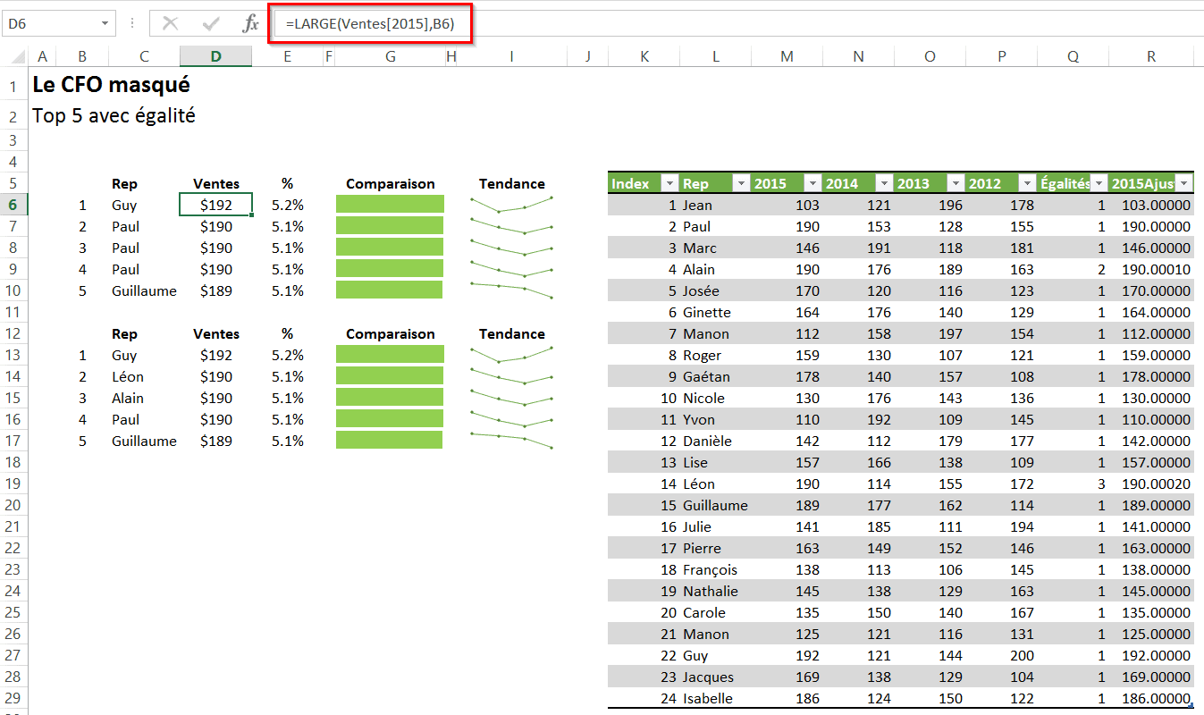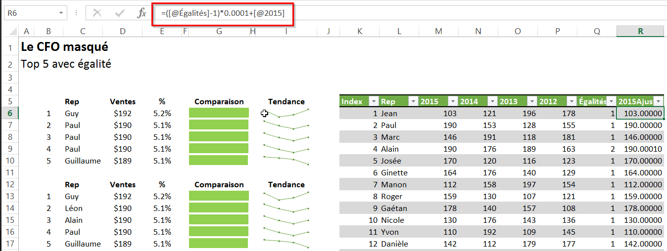Ensuite, j’ai ajouté une dernière colonne à ma table de ventes, soit la colonne [2015Ajust]. Cette colonne me permet simplement de modifier de façon négligeable, les montants de ventes de 2015. Si vous jetez un coup d’oeil aux données du tableau de ventes, vous verrez que 3 représentants ont effectué des ventes de 190$, soit Léon, Alain et Paul. Par contre, dans notre premier tableau (cellules B6 à I10), c’est Paul qui apparaît 3 fois, en position 2, 3, et 4, puisqu’il est le premier qu’Excel trouve dans la colonne [2015] de la table de ventes. La colonne [2015Ajust] recalcule les ventes de 2015, en prenant soin d’ajouter un très faible incrément aux montants égaux, cet incrément dépendant du chiffre de la colonne [Égalités]. Ainsi, lorsqu’un chiffre de ventes apparaît plus d’une fois, le chiffre dans la colonne [Égalités] augmente et le montant de ventes 2015 ajusté également (mais de façon non significative).