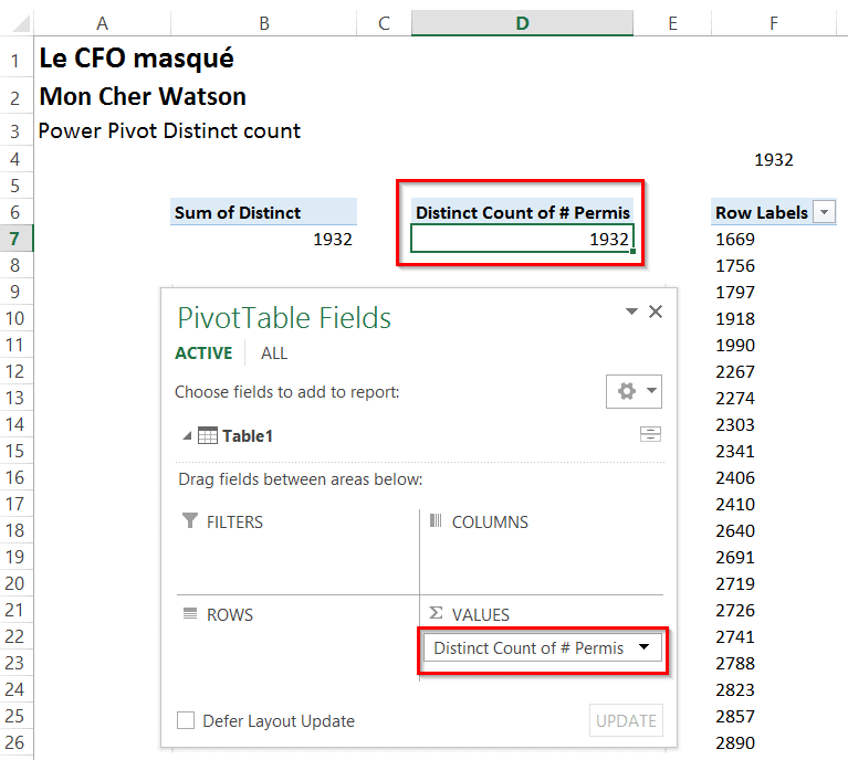 Si votre tableau croisé dynamique puise ses données dans un modèle de données (Power Pivot), vous verrez qu’il existe une fonction Disctint Count dans les paramètres de champs de valeurs. Vous pourrez donc simplement utiliser cette option.
