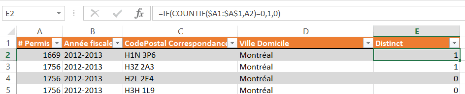 Dans l’exemple ci-dessous, il y a plusieurs fois le même numéro de permis, qui correspond à différentes adresses. Il pourrait par exemple s’agir d’une base de données de professionnels (avec des numéros de permis), qui travaillent à différents endroits. Pour connaître le nombre de données distinctes, sans altérer la base de données, vous pourriez donc ajouter la colonne supplémentaire dont nous venons de discuter au point précédent dans votre base de données. Notez que la formule rapporte un 1 pour la première apparition du numéro de permis 1756 et un 0 pour les deux autres apparitions.
