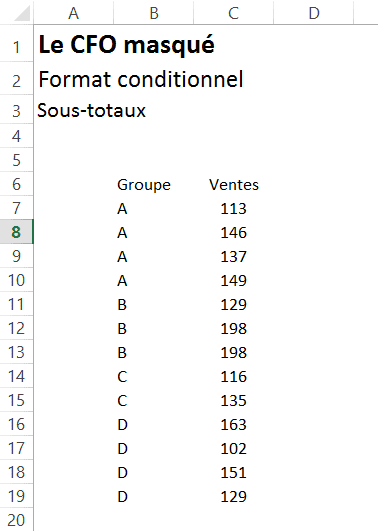 Lors de la dernière formation que j’ai offerte en classe, un apprenant m’a demandé comment il pouvait faire pour mettre en évidence les sous-totaux dans Excel d’une longue liste de données, après avoir utilisé la fonction du même nom. Évidemment, il savait comment le faire manuellement, mais il souhaitait obtenir un truc pour le faire rapidement. Cet article vise à répondre à cette question.