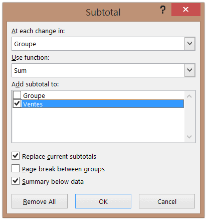 Nous avons débuté par insérer des sous-totaux de ventes, à chaque changement de groupe.