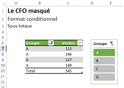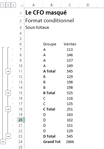 Bon truc! Moi, j’utilisai les filtres, pour ne filtrer que les sous-totaux et les formater par la suite.