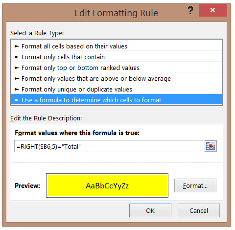 Pour mettre en évidence les sous-totaux et le grand total, nous avons sélectionné notre plage de données et nous avons inséré la formule suivante dans la boîte de dialogue du format conditionnel: