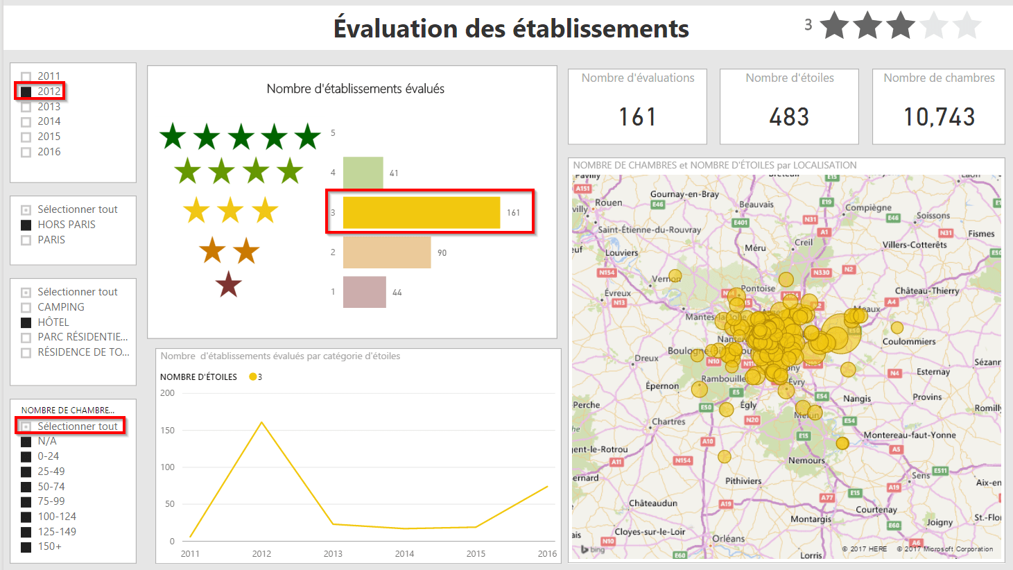 Ci-dessous, j’ai sélectionné une autre année, soit l’année 2012 et j’ai coché la case Sélectionner Tout du segment représentant le nombre de chambres. J’ai ensuite cliqué sur la barre jaune du graphique à barres pour n’afficher que les données concernant les hébergements ayant obtenu 3 étoiles en 2012.